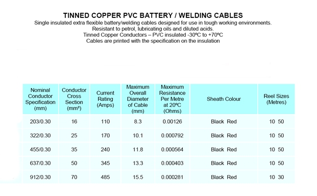 This battery cable is very similar to flexible battery cable except that the copper conductors are tin plated, making them more suitable for marine and other corrosive environments. Cable details are given in the blue boxes below. For example, 011001, has 203 strands of 0.3mm diameter tinned copper wire (203/0.3), has a conductor cross sectional area of 16mm², a capacity of 110 Amps and its diameter including insulation is 8.3mm. Click on the link below for full cable data.